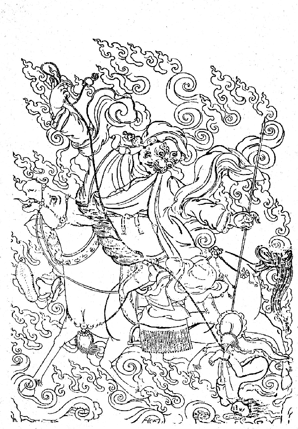 История этого защитника описана в тантре «sPu gri dmar po'i rgyud» («Тантра красного лезвия»), которую открыл тертон Пема Вангьял в Самье Чимпху. Вот вкратце её изложение. Во времена Будды Осунга (санскр. Кашьяпа) в местности Чангра Мугпо (lCang ra smug po) у царя Лидже Сангва (Li rje gsang ba) и царицы Утпали Дагмо (Utpal'i bdag mo) родился сын по имени Чорпо (mChor po). Когда сын подрос, он почувствовал разочарование в сансаре и принял обеты гелонга (полные монашеские обеты). С тех пор он пребывал в медитации, уединившись в лесу. Однажды принцесса по имени Деваджин (bDe ba 'byin), дочь правителя данной местности, пришла искупаться в пруду возле леса. Во время купания её укусила огромная змея. Гелонг увидел это и спас принцессу, приложив вытяжку из трав на место укуса. Но окружение принцессы и её слуги, увидев гелонга рядом с принцессой, донесли царю, что монах и принцесса имели интимную близость. Не проведя должного расследования, царь послал палачей, чтобы убить гелонга. Когда принцесса узнала об этом, она сказала царю о том, что в действительности гелонг спас ей жизнь. Но царь не послушал её. Тогда принцесса заявила: «Несмотря на то, что мы с гелонгом остались невинными, ты внял наветам слуг и свиты. Пусть в будущем я буду рождена сестрой гелонга и убью тебя и всё твоё окружение». Сказав это, она бросилась с обрыва, покончив жизнь самоубийством. Гелонг, узнав о намерении царя, оседлал лошадь и скакал прочь, пока не нашёл укрытия в другой стране под властью другого правителя.