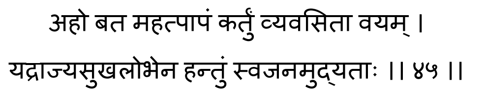 yad-rAjya-sukha-lobhena hantuM sva-janam-udyatAH || 45 ||