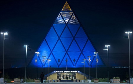 Другой формой такого «единения» являются съезды наиболее авторитетных представители ислама, христианства, иудаизма, синтоизма, индуизма и буддизма, которые проводятся в Астане и ключевой идеей которых является заменить «идеологию противостояния» на «культуру мира»116. Форумы проходят с 2003 г. раз в три года, при этом второй съезд состоялся уже в специально построенном для него «Дворце мира и согласия» (названном так по аналогии с «Храмом понимания»), архитектура которого говорит сама за себя. Это масонская пирамида со светящимся верхом, представляющая собой «храм» поклонения культу солнца. Внутреннее устройство ее включает три уровня: темный подвальный этаж, где размещен оперный театр (для непросвещенного народа); средний уровень — конференцзал с громадной фигурой солнца, где заседяют «просвещенные» лидеры, обсуждающие проблемы, препятствующие установлению Новой Эры; наконец, вершина, представляющая достижение «просветления» на индивидуальном и мировом уровне117.