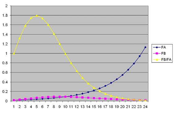 Как было указано выше, в соответствии с гипотезой Всеобщего взаимодействия, силы, действующие на каждое из двух сближающихся тел с разными массами, будут различны. Графики этих сил при массе mB=1 и расстоянии L=4, а также и график их отношения, приведены на рисунке 12.