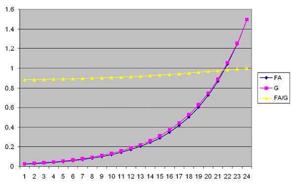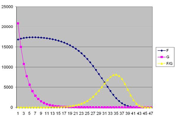 Наконец, на рисунке 14 приведены графики сил, действующих в соответствии с гипотезой Всеобщего взаимодействия – F и всемирного тяготения – G при равных массах сближающихся объектов (mA=mB=1) в зависимости от расстояния L, изменяющегося в пределах от 0.0075 до 15.046 (отношение 2000).
