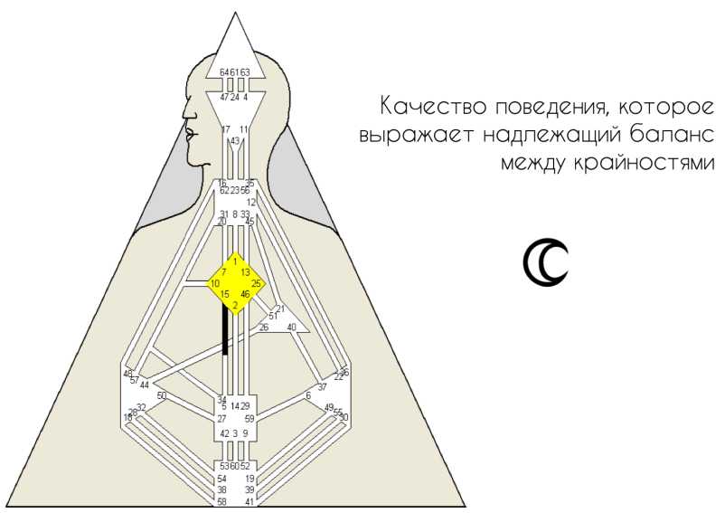 В астрологии есть понятие домов. Рассматривая это через призму Дизайна, можно сказать, что дом Луны находится в 15-х воротах. Луна как бы говорит: «Да, это для меня не ново, мне это привычно, это моя природа, и это чудесно — это еще больше меня усиливает. Мне здесь будет гораздо легче найти правильный баланс между крайностями», поскольку сам баланс и является частью этой гексаграммы. И химия, которая связана с этим и которая необходима для того, чтобы самостоятельно справляться со всеми этими крайностями, является привычной и нормальной, поскольку опять же мы имеем дело с метаболизмом печени.