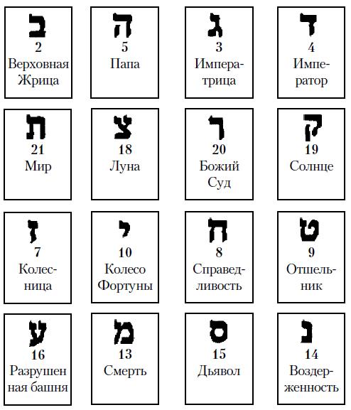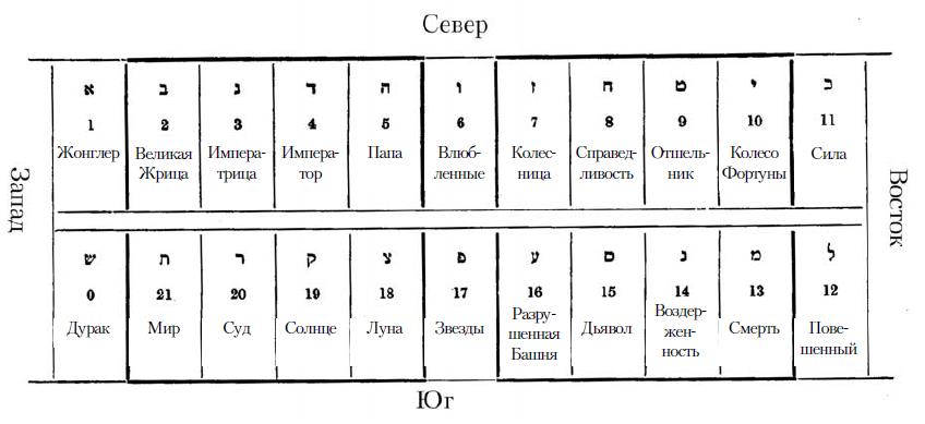 Арканы, соответствующие двадцати двум буквам еврейского алфавита, должны были быть расставлены на стенах тайных склепов в храмах Осириса в следующем порядке (См. след стр.: схема, в которой карты расположены между частями света: Восток, Запад, Север, Юг).