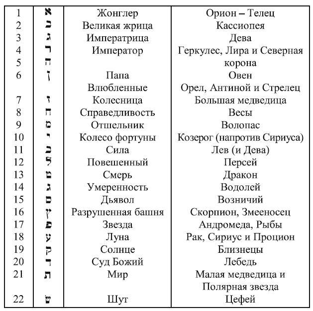 В любом случае арканы Таро объясняют многие аномалии греческой мифологии. Мы не можем здесь входить в подробности этой темы, ибо ограничены рамками книги. И должны довольствоваться тем, что предоставим читателю таблицу, отражающую созвездия в их соотношении с 22 Старшими арканами Таро и, следовательно, с 22 буквами еврейского алфавита, хотя последнее соответствие не так очевидно. Затем проследим планисферную группировку арканов Таро, согласно порядку созвездий, и закончим пентаклем в форме двойной гексаграммы, в которой еврейские буквы будут представлять знаки зодиака и околополярные созвездия, которым они соответствуют, согласно первой таблице.