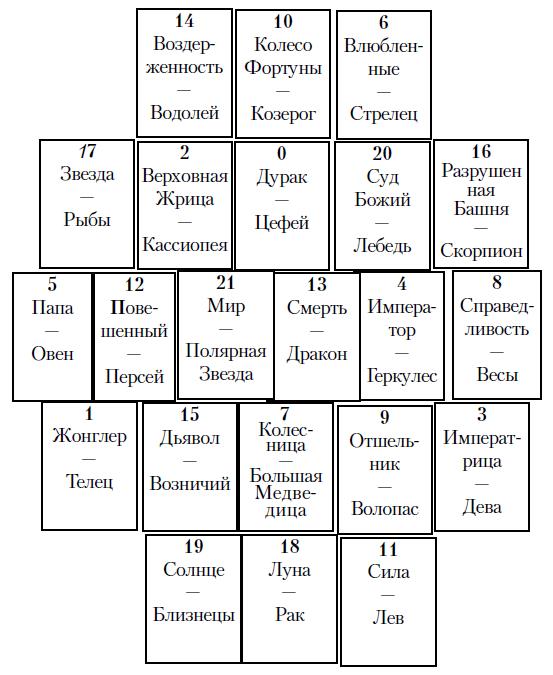 Это мнение подтверждается соответствием, которое существует между арканами, когда они расположены таким образом.