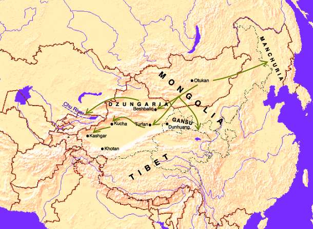 После переселения все четыре группы уйгуров приняли буддизм. Поселившиеся на северной границе Таримской впадины приняли тохарийско-согдийско-ханьскую форму, распространенную в Турфане и Куче, те же, кто переселился в долину реки Чу – западно-тюркско-согдийскую форму, тогда как осевшие в Кашгаре – кашгарскую форму. Столетия спустя все ветви уйгуров, за исключением желтых уйгуров, в конечном счете приняли ислам. Чтобы лучше понять динамику обращения тюрок в ислам, давайте еще раз исследуем причины смены уйгурами религии, на этот раз их перехода из манихейства в буддизм. Мы будем рассматривать две самые большие группы: уйгуров Кочо и желтых уйгуров.