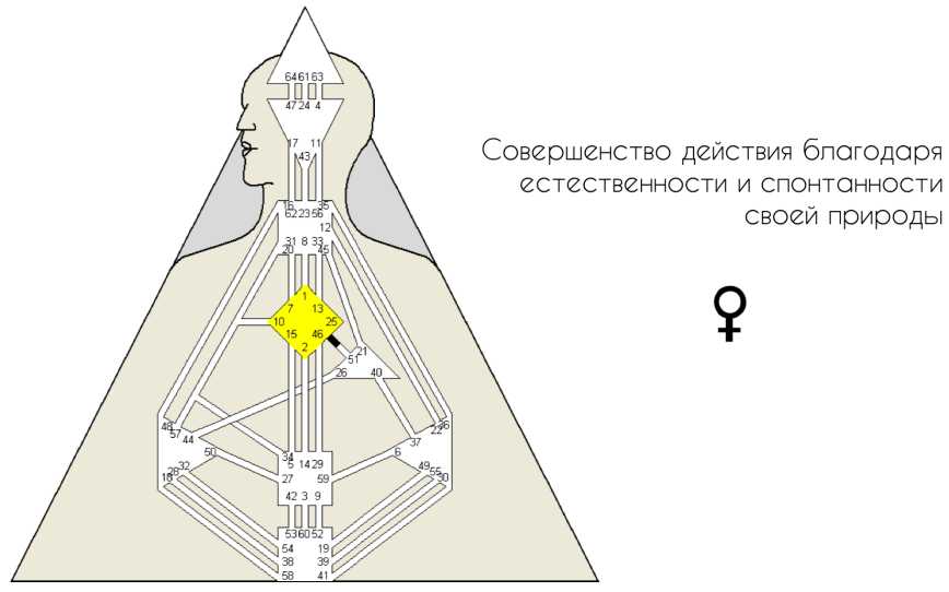 Я считаю очень полезным рассматривать анатомию гексаграмм. Нижняя триграмма 25-х ворот — это гром. В гармоничных 51-х воротах канала Инициации нижняя и верхняя триграммы идентичны и также представляют собой гром. То есть это качество грома в канале Инициации проявлено очень мощно, поскольку присутствует в трех из четырех триграмм этого канала. Нижняя триграмма всегда представляет суть гексаграммы — ее основание. С 4-й линии и выше качество основания гексаграммы начинает проявлять себя во внешнем мире. Нижняя часть стремится вверх, к пробуждению, и суть этого пробуждения заключается не в том, чтобы шокировать кого-то другого. Ключевой фразой 51-х ворот является способность откликаться на хаос и шок. То есть не создавать шок кому-то другому, а откликаться на беспорядок и шок через распознавание и адаптацию. Основанием здесь является способность тела пережить шоковую ситуацию. Тело «говорит»: «Хорошо, если что-то случится во внешнем мире, то я смогу с этим справиться — я смогу это выдержать», и, разумеется, если наш потенциал раскрыт полностью, тогда мы на это способны. Это и есть невинность, когда все части нашего существа проживаются полностью.