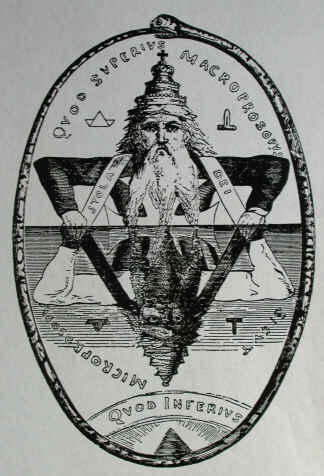 В другом изображении шестиугольника, воспроизводимом в книге оккультиста Элифаса Леви «Догма и ритуал Высокой Магии», изображены те же «единство и борьба противоположностей», но треугольники имеют уже обратное расположение: светлый треугольник сверху, черный внизу. Рисунок показывает борьбу двух старцев: у того, чей лик увенчан короной с крестом, черные руки, от которых отбиваются белые руки другого. Старец со светлым ликом и черными руками изображает христианство — «добро по виду и зло по делу», а другой старец — сатану — «зло по виду и добро по делу». Светлые руки сатанизма держат светлую ленту, охватывающую шею светлого старца, на которой написано: «епитрахиль Бога». Надпись на латинском языке означает: «что выше — то ниже, макропрософус (большой мир) и микропрософус (малый мир)». Она воспроизводит древнюю формулу Гермеса: «Как наверху, так и внизу, как внизу, так и наверху, и нет малого и великого, а все едино». Это пантеистическое понимание видимого материального мира как отражение мира невидимого. Черный треугольник символизирует погружение «духа» в воды поднебесной материи, а белый — духовный подъем6.