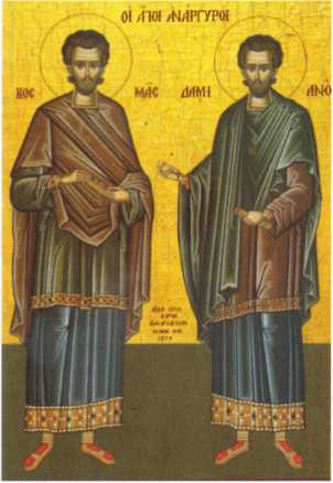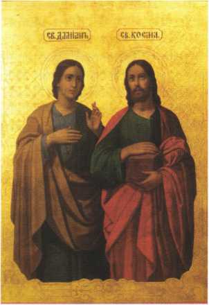 Святые мученики, чудотворцы и бессребреники Косма и Дамиан — родные братья, родом из Рима, врачи по профессии, приняли мученическую кончину в Риме при императоре Карине (283–284). Воспитанные родителями-христианами в правилах благочестия, они вели строгую, целомудренную жизнь и были удостоены от Бога благодатного дара исцеления болезней. Своим добрым и бескорыстным отношением к людям, соединенным с исключительным милосердием, братья многих обращали ко Христу. Святые обычно говорили больным: «Не своей силой мы врачуем болезни, а силой Христа, Истинного Бога. Веруйте в Него и будете здоровы». За бескорыстное лечение недугующих святых братьев называли «безмездными врачами».