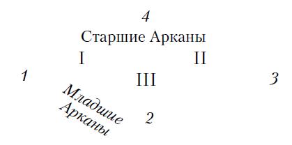 6. Перемешайте эти семь карт, и когда Спрашивающий их снимет, возьмите три верхние карты, не глядя на них и не открывая их, разложите их треугольником в следующем порядке: