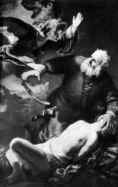 ИСААК НА ЖЕРТВЕННИКЕ. Однажды бог, желая убедиться в преданности Авраама, решил подвергнуть его испытанию: велел ему принести в жертву и сжечь своего любимого сына Исаака. Сын был единственной надеждой Авраама, но тем не менее он скрепя сердце подчинился воле божьей. Ночью тайком от Сарры он наколол дров для жертвенника, приготовил еду, взял сына и двух слуг и отправился в путь. На третий день они достигли подножия горы. Авраам приказал слугам обождать внизу вместе с ослом, сам же с Исааком поднялся на вершину. Сын нес дрова, отец в одной руке держал горящую лучину, а в другой острый нож. По дороге Исаак спросил: «Отец мой… вот огонь и дрова, где же агнец для всесожжения?» Авраам ответил: «Бог усмотрит себе агнца для всесожжения, сын мой». На вершине горы Авраам построил из камней жертвенник, связал потрясенного Исаака и уложил его на дровах. Затем он занес нож для удара, но бог через ангела своего остановил его руку и благословил за то, что, покорный велению бога, он готов был принести в жертву своего единственного сына. В награду бог еще раз заверил Авраама, что его потомство будет многочисленным, как звезды на небе и песчинки на морском берегу. В это время заблудившийся баран запутался рогами в терниях. Авраам принес его в жертву богу вместо Исаака и двинулся в обратный путь.