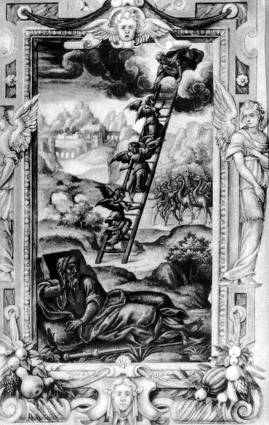 Иаков отправился в дальний путь, как бедный странник с сумой за плечами и посохом в руке. Он должен был выскользнуть из лагеря незамеченным, поздней ночью, когда грозный Исав крепко спал в своем шатре. Он шел все время пешком, ночуя под открытым небом. Однажды, когда стемнело, он подложил себе под голову камень и, утомленный долгой дорогой, заснул. Ему приснился очень странный сон: он увидел лестницу, которая верхушкой касалась неба. По ней ходили ангелы, а на самой верхней ступеньке стоял Яхве и милостиво говорил ему: «Я господь, бог Авраама, отца твоего, и бог Исаака. Землю, на которой ты лежишь, я дам тебе и потомству твоему. И будет потомство твое, как песок земной; и распространишься к морю, и к востоку, и к северу, и к полудню… И вот, я с тобою…»