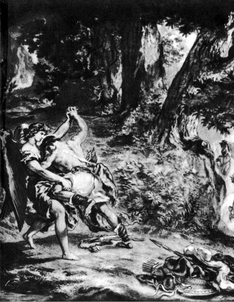 Ночь Иаков провел в лагере, и там с ним произошло нечто весьма странное. Ему приснилось, будто он яростно борется с богом.{16} «Не отпущу тебя, пока не благословишь меня», — крикнул Иаков богу, словно равному себе. Он боролся изо всех сил и наконец заставил бога благословить его как законного наследника Исаака. Бог выдерживал натиск Иакова до рассвета и, увидев, что одолеть его не может, коснулся жилы его бедра, которая немедленно засохла. Вырвавшись таким образом из рук Иакова, бог благословил его и сказал, что отныне имя его будет Израиль, что значит «боровшийся с богом».