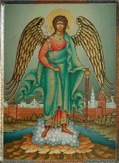 Икос: Уничиженную душу мою многими соблазны, ты, святый предстателю, неизреченныя славы небесныя сподоби, и певец с лики безплотных сил Божиих, помилуй мя и сохрани, и помыслы добрыми душу мою просвети, да твоею славою, Aнгеле мой, обогащуся, и низложи зломыслящия мне враги, и сотвори мя достойна Царствия Небеснаго.
