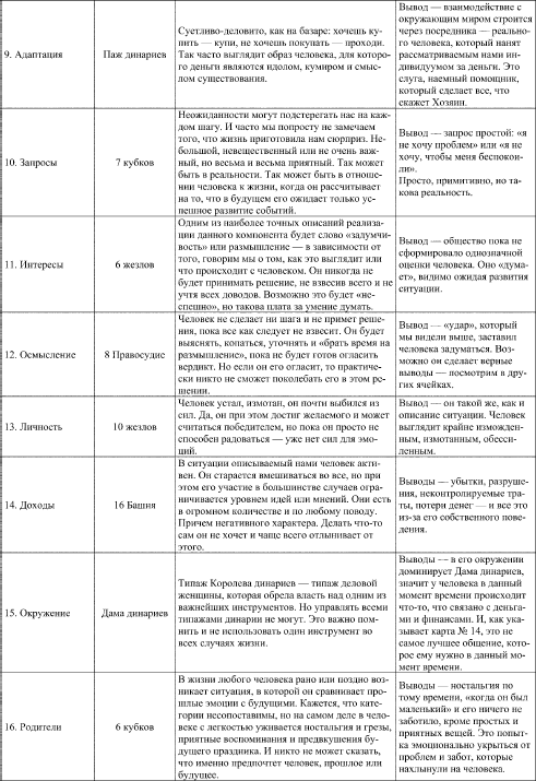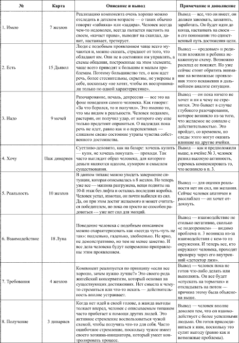 Как вы можете видеть, расклад получился довольно емкий и содержательный. Главное, он образует общую целостность: вы видите описание человека, и у вас не возникает вопроса, а почему он себя так ведет? Это видно в раскладе – он такой, со всеми достоинствами и недостатками и со своей манерой взаимодействия с окружающим миром.