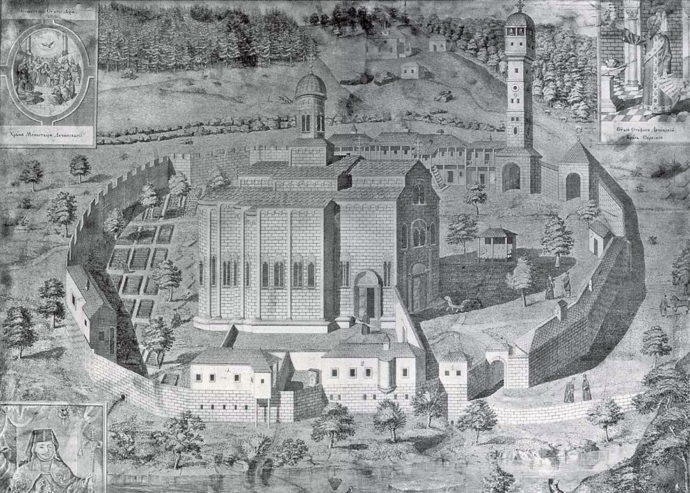 Монастырь Дечаны. Гравюра Густава Адольфа Миллера, 1746 г. Рисунок Георгия Стояновича, 1745 г.