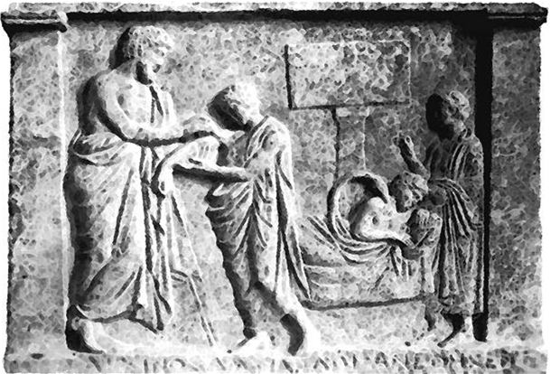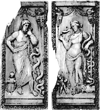 Рис. 76. Асклепий и Гигейя (резьба по слоновой кости, Рим, Италия, конец IV в. до н. э.)