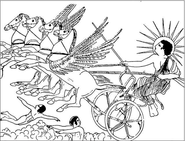 Еще одна из ролей Аполлона – быть солнечным богом по имени Феб. Он управляет солнечной колесницей, пересекая небо (рис. 80), лучи солнца образуют нимб вокруг его головы, в то время как эфебы (маленькие звездные мальчики) падают в море. Это пример того, как различные божества слились в единое целое и потом вся мифология превращается в нечто такое, чем она раньше не была.