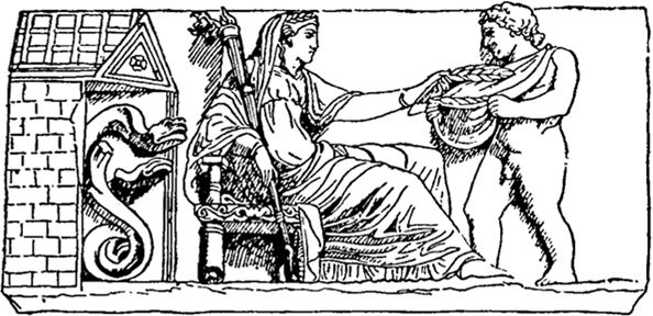 Деметра восседает на священной корзине, которую обвивают змеи, и из этой корзины выползает змей, тот, что сбрасывает свою кожу, чтобы пережить обновление, и символизирует связь животворного сознания с миром времени и пространства.