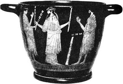 Рис. 115. Жрец стоит между Геркулесом и молодым участником обряда инициации (чернофигурный скифос, античная Греция, V в. до н. э.)
