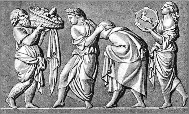 Рис. 118. Посвященному вскоре покажут содержимое корзины (каменный барельеф, местонахождение неизвестно, дата неизвестна)