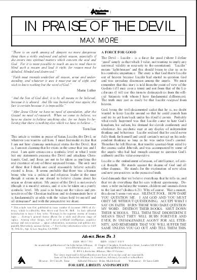 Свои принципы Мор рассматривает как этические установки, придающие смысл, направление и цель человеческой жизни, то есть имеющие отношение к религии. И действительно, хотя экстропианство выступает под маркой науки, его религиозные корни хорошо проявились в одной из статей Мора, явно рассчитанной не на широкую публику. Речь идет о работе «Во славу Дьявола», напечатанной журналом «Либертарианский Альянс» в 1991 г.133