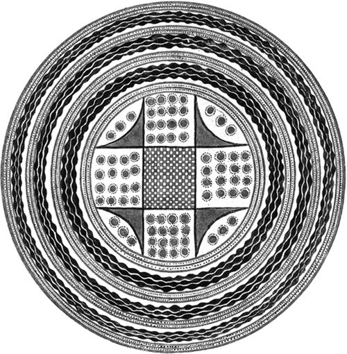 Примерно в 4000 гг. до н. э. в шумерских городах возникает понятие об организованном, ограниченном эстетическом пространстве, появляются различные абстрактные изображения. В центре керамического блюда из шумерского города Халафа, которое вы видите на рис. 39, показан процесс цветения в виде маленького цветка Вселенной. В центре цветка, как и в центре города, находился храм. Важно, что изображение разделено на квадраты. Это композиция целого города, где изображаются четыре касты. В искусстве эпохи палеолита нет подобной целостности, там присутствует мотив пещеры и более или менее реалистичное изображение животных. А на этом абстрактном рисунке присутствует приятная глазу эстетическая композиция, балансирующая четыре квадрата и четыре касты. Здесь мы видим четыре угла и выделенный центр.