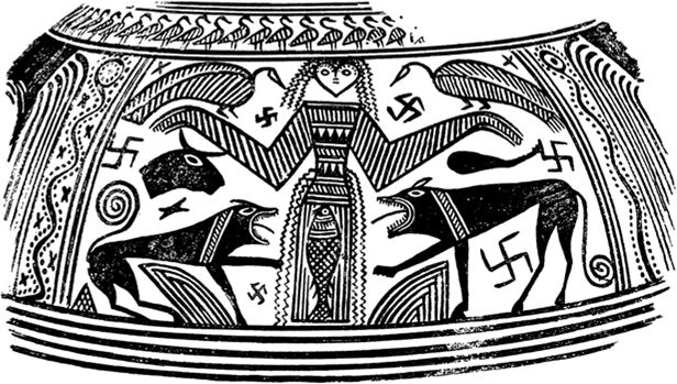 Рис. 40. Богиня в окружении животных и свастик (керамика, меднокаменный век (энеолит), Ирак, 4000 лет до н. э.)