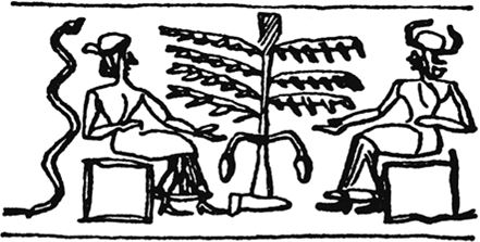 Рис. 45. Бог и Богиня со змеей позади, сидящие у Древа жизни (глиняная печать, шумерская культура, Ирак, 2500 лет до н. э.)