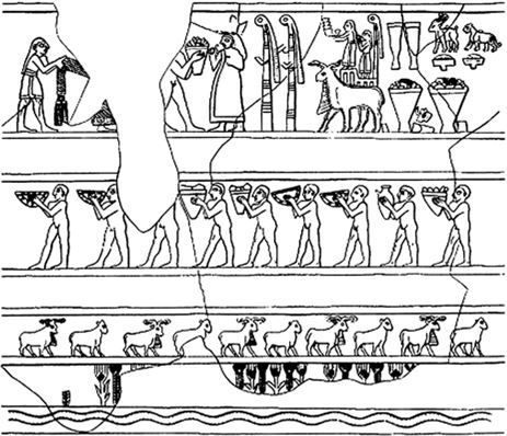 Рис. 46. Ваза из Варки (резьба по алебастру, шумерская культура, Ирак, 3000 лет до н. э.)