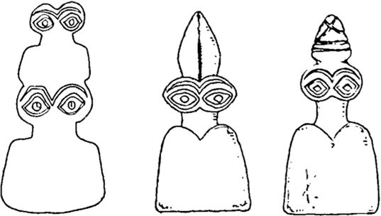 Рис. 48. Раннешумерские изображения «глазастых» богинь (алебастр, Сирия, 3500–3000 гг. до н. э.)