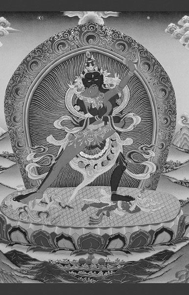 Передавая тантры, Будда принимал форму Ваджрадхары (тиб. Дордже Чанг). Это имя переводится как «Держатель Алмаза». Алмаз (санскр. ваджра), выражая собой стабильность и неразрушимость, относится к контексту постижения пустоты, неразрушимого по своей природе. «Дхара», «держатель», означает, что Будда полностью обладает этим постижением. Ваджрадхара изображается держащим в скрещенных у сердца руках колокольчик, символ понимания пустоты, и ваджру, символ искусных средств, используемых для того, чтобы помогать существам приходить к этому пониманию. Вот почему его также называют «Союз мудрости и метода».