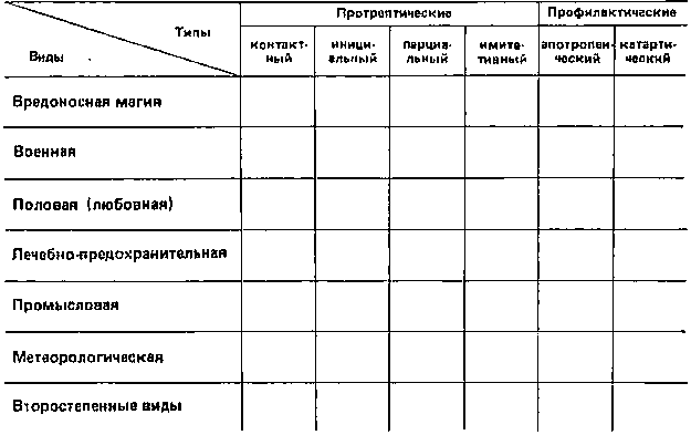 Можно изобразить графически эти две перекрещивающиеся классификации магических действий, как решетку, образованную вертикальными колонками, которые соответствуют типам магических обрядов, и горизонтальными рядами, означающими виды этих обрядов. В клетках такой решетки и разместятся отдельные конкретные магические обряды, каждый из которых, таким образом, получает двойное обозначение — вида и типа. Подобная решетка будет выглядеть следующим образом: