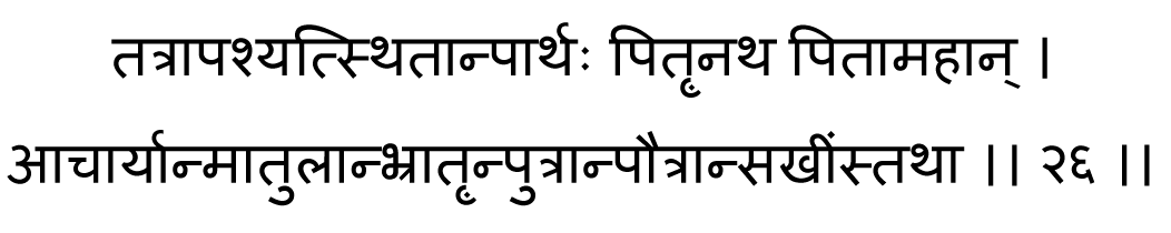 AcAryAn-mAtulAn-bhrAtRn-putrAn-pautrAn-sakhIMs-tathA || 26 ||