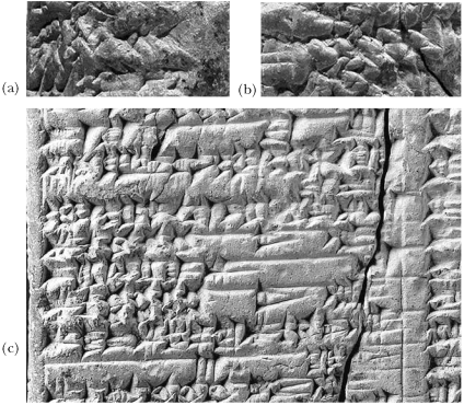 (a) Тесно выписанные знаки ??R в строке 12 Таблички Ковчега. (b) Еще несколько таких знаков в строке 21 Таблички Ковчега, (с) Каллиграфически выписанные знаки ??R в Шумерском царском списке (копия Weld-Blundell’а)