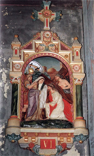 На десятом этапе крестного пути нас поражают некоторые подробности, а, прежде всего то, что Христос изображен нагим. Разделся он очевидно, для того чтобы пройти под ВОДОПАДОМ.