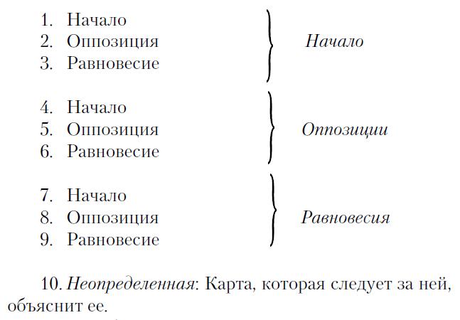 Первая карта в каждой из трех кучек будет означать начинание; вторая – оппозицию, антагонизм; третья – равновесие, которое дает нам следующую общую последовательность в наших 10 картах.