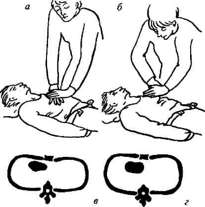 Рис. 14. Проведение закрытого массажа сердца: а – толчкообразные движения на грудину пострадавшего; б – пауза между толчками; в, г – схема движения грудной клетки и сжатия сердца