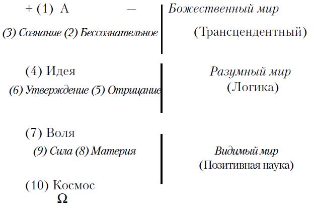 Крайние элементы, А и ?, Дух и Материя, одинаково не постижимые для человеческого разума в их бесконечном величии и бесконечной малости[71], не только связаны вместе неизменными промежуточными цепями, но они также совершают постоянно нисходящее движение от одного к другому, в котором Дух становится Материей путем последовательных разложений, которые выражают Идею, Волю и Космос. Это утверждает Творение.
