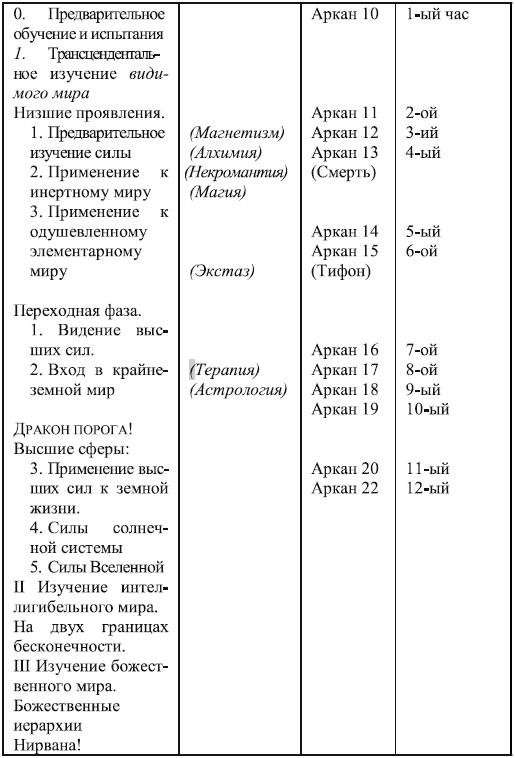 Кажется, что это противоречит предыдущему замечанию, что описание Посвящения, т. е. обратного восхождения, открывается 10-ым арканом, а не 14-ым. Однако, это не так, потому что в эволюции существо должно проходить обратно в противоположном направлении, чтобы закончить синтез, каждую стадию, которой А распадалась в ходе своей инволюции. Человек является действительным результатом такого рода предшествующего его современному состоянию, но такой работы, которую, поднявшую его от ? на стадию воли, он совершенно не осознает; сначала он был подвержен ей под роковым давлением только чистой Силы, потом – инстинктов, желаний и страстей; следовательно, его предыдущая эволюция ему не известна, и по-прежнему, как он может справиться с каким-нибудь из этих миров, не будучи знакомым со всеми ими. Таким образом, первым делом в Посвящении должно быть новое нисхождение на его первые ступени (в) Эволюции, чтобы познакомиться со всеми уровнями, всеми силами и всеми существами, через которые он прошел, проникнуть в корни жизни и самой смерти и научиться управлять всеми ими.