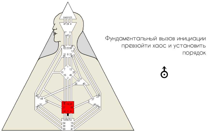 Здесь можно увидеть связь с 38-й гексаграммой контура Знания, которая показывает нам, почему люди ведут себя именно так. Они не хотят знать. В немецком у нас есть выражение «сидеть на своих ушах». Когда действия для преодоления замешательства ведут к отчуждению. Здесь требуется мужество, чтобы отстаивать свои убеждения. И 5-я линия связана с каналом 34-10 — каналом следования собственным убеждениям. Необходима стойкость, чтобы следовать своим убеждениям несмотря ни на что, и опять же это очень индивидуально. В определенности 34-10 нет осознанности. Это лишь внутренняя сила. 34-е в Сакрале и 10-е в G-центре, то есть вся моя жизненность выражается через уникальное поведение, усиливая мою любовь к себе... Это похоже на панцирь черепахи. Это нечто, что касается нашего отношения к собственной жизни, где нет места ничему интеллектуальному. По сути, это связь физического мира с нашим позвоночником. Это означает: «Я такой. Это мой стержень». Канал 34-10 связан с позвоночником. Бодиграф — это также и матрица мозга. Можно сказать, что мозг имеет хребет. Это и защита от нападения извне и способность отстаивать свои убеждения.