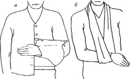 Рис. 4. Шинирование верхней конечности: а – с помощью полы куртки; б – с помощью бинта