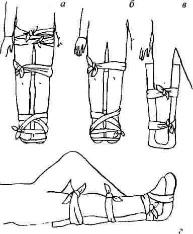 Рис. 5. Шинирование при переломах костей нижней конечности: а – при переломе бедра; и т. д.