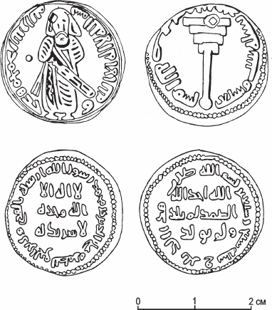 Арабские историки датируют появление монеты нового типа (без всяких изображений, с одними только надписями на арабском языке) 74 или 76 г. х., однако монеты этого типа указанных годов пока не найдены. Наиболее ранний динар с именем Абдалмалика и датой относится к 76/695–96 г. Он представляет собой компромисс между предыдущими динарами византийского типа с арабскими религиозными формулами и чисто эпиграфическими мусульманскими динарами (рис. 12). На лицевой стороне этого динара изображен стоящий халиф с мечом на перевязи и треххвостым бичом. Надпись по кругу гласит: «Во имя Аллаха, нет божества, кроме Аллаха, он – единственный, Мухаммад – посланник Аллаха». На обороте в центре еще осталось изображение деформированного креста на трехступенчатом возвышении, а надпись по кругу гласит: «Во имя Аллаха чеканен этот динар в году семьдесят шестом». В различных коллекциях имеется еще два десятка похожих динаров, различающихся по качеству изображения, разного веса и размера, чеканенных в Аммане, Джибрине, Иерусалиме, Киннасрине, Курусе, Ма‘аррат Мисрине, Манбидже, Сармине и Халебе. Несколько особняком стоят 34 динара с фигурой халифа, но без имени и даты, в легенде которых употреблено характерное выражение «халифату-л-лахи».