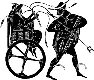 Рис. 133. Триптолем в своей волшебной колеснице следует за Гермесом (чернофигурная ваза, античная Греция, VI в. до н. э.)
