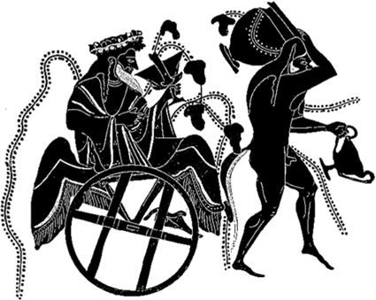 Рис. 134. Дионис в своей волшебной колеснице следует за Силеном (чернофигурная ваза, античная Греция, VI в. до н. э.)