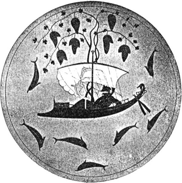 Дионис позволил захватить себя; попав на пиратский корабль, он зарычал, как леопард, и через палубу и мачты корабля стал прорастать виноградник, он рос через весла – везде, и пираты в ужасе попрыгали в море, где превратились в дельфинов (рис. 135).