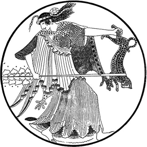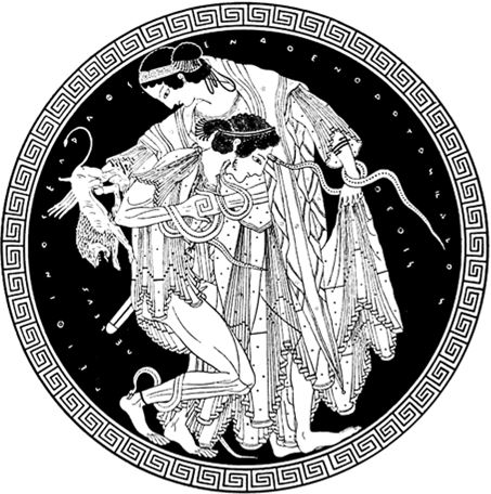 Но дело в том, что речь здесь идет совсем о другом. Эта история уходит корнями в гораздо более древнюю традицию почитания Матери-Богини и совершенно не связана с политическим влиянием Афин и традициями мужской культуры. Мы видим в ней знакомых нам животных, сопровождавших Богиню с Крита: в руках ее – змеи, пантера или лев – на ее голове. Мы точно знаем, кто перед нами, и мы видим, что она просвещает мужчину.