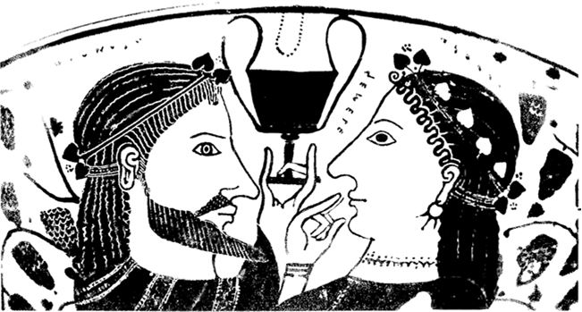 Рис. 140. Дионис и Семела (кратер, Древняя Греция, 550 г. до н. э.)