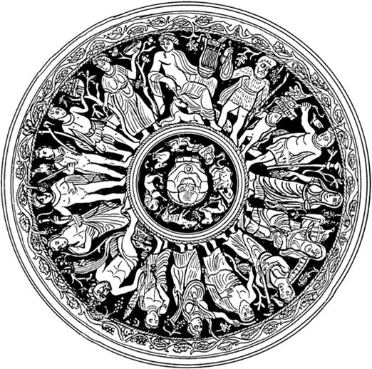 В центре этой чаши изображена Деметра, восседающая на мистической корзине (рис. 142), в руке у нее кубок, который можно воспринимать как грааль или фиал с кровью Диониса, украшенный изображением виноградника. Вокруг расположены шестнадцать фигур, а следуя за ними, мы сможем пройти все мистическое странствие, шаг за шагом.[146]